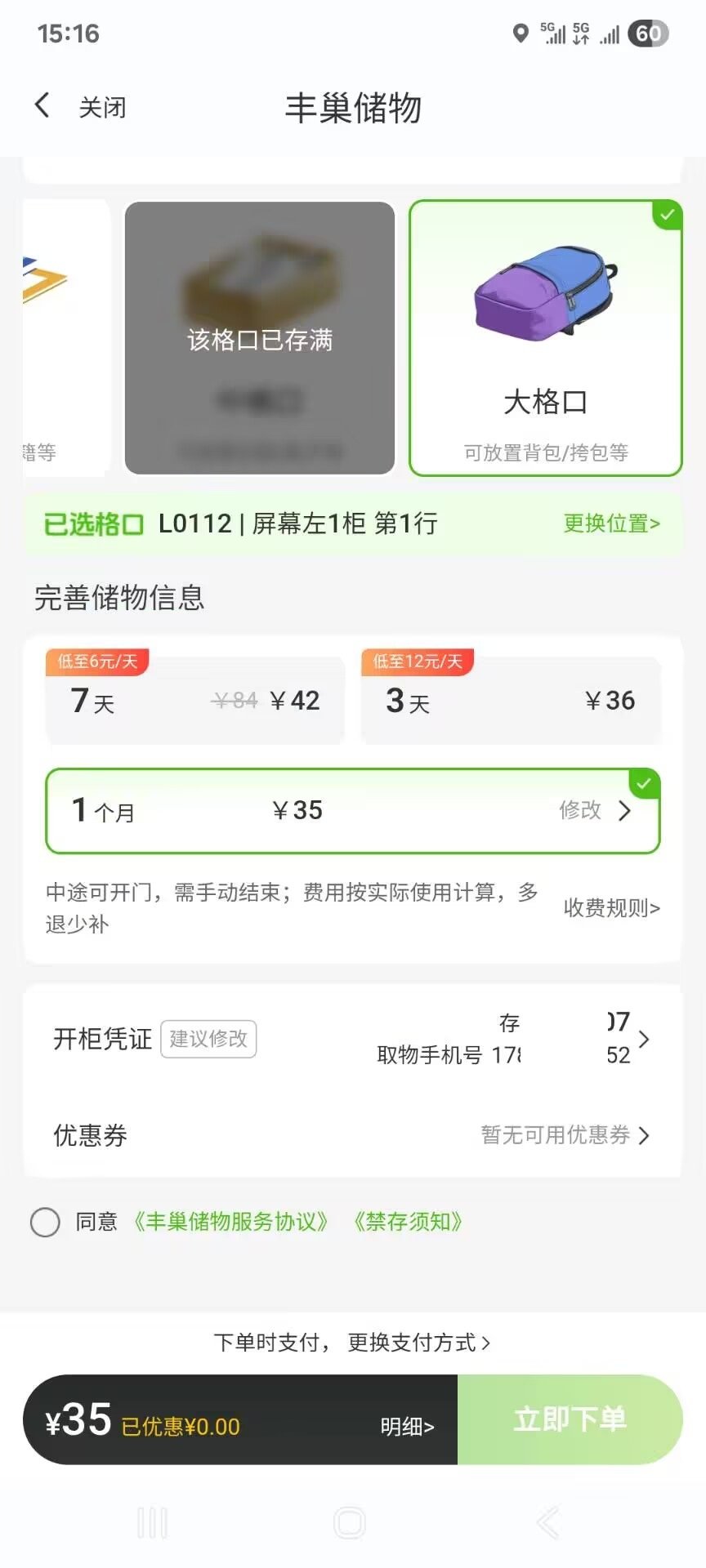 丰巢储物定价表。